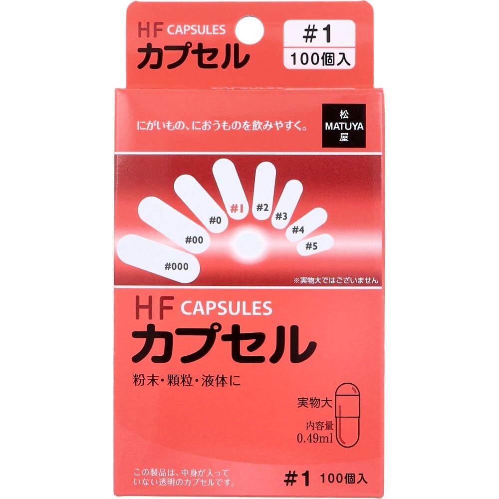 ▼▼▼▼▼▼注意事項▼▼▼▼▼▼・送料込み(送料700円が商品価格に含まれています) 一部地域では追加送料あり。・お取り寄せ商品です。弊社にて手配後、メーカー・卸業者からの直送になります。・まれにメーカー欠品、出荷遅延等が発生致します。問題発生時は別途メールにてご連絡致します。・配送方法の指定、日時指定、置き配、ギフト対応、他商品との同梱配送などは対応できません。・まとめ買いや複数購入の場合は通常より発送に時間が掛かる場合がございます・複数個口の場合、2階以上への搬入ができない場合があります。(その場合は1階での受け渡しとなります)・大型連休、お盆、年末年始などは発送をお休みさせていただく場合がございます・メーカー都合により、パッケージは予告なく変更される場合がございます・梱包用のダンボールはリサイクル品を使用させていただきます。・注文に関するご連絡(注文確定通知・発送通知など)はメールでご案内させていただきます※商品ページの内容について、少しでもご不明な点などがございましたら購入前に一度ご連絡ください▲▲▲▲▲▲注意事項▲▲▲▲▲▲〇商品説明粉末・顆粒・液体に。●この製品は、中身が入っていない透明のカプセルです。●こんな時にどうぞ!・粉末・顆粒を飲む時。・液体を飲む時。・苦いもの、におうものを飲む時。【名称】ゼラチン加工食品【サイズ別内容量】#000:1.37mL#00:1.01mL#0:0.68mL#1:0.49mL#2:0.37mL#3:0.28mL#4:0.21mL#5:0.13mL【原材料名】ゼラチン(外国製造)【栄養成分表示(1箱100個あたり)】エネルギー:22kcaLたんぱく質:6.4g脂質:0.02g炭水化物:0g食塩相当量:0.04g【保存方法】高温の場所、湿気の多い場所、直射日光の当たる場所を避けて保存して下さい。【アレルギー物質】ゼラチン【使用上の注意】・カプセルのキャップとボディを離しボディのみに入れ、キャップをしめてからご使用ください。・ご使用に際しては手指を清潔にして、液体をご使用の際は飲む直前にすばやく入れてお飲み下さい(カプセルが速やかに溶ける場合もございます)。・小児の手の届かない所に保管してください。開封後は袋のチャックをしっかり押して閉めてください。・この製品は、中身が入っていない空のカプセルです。〇商品仕様個装サイズ:81X150X30mm個装重量:約24g内容量:100個入【発売元:株式会社松屋】(出典:富士平工業)
