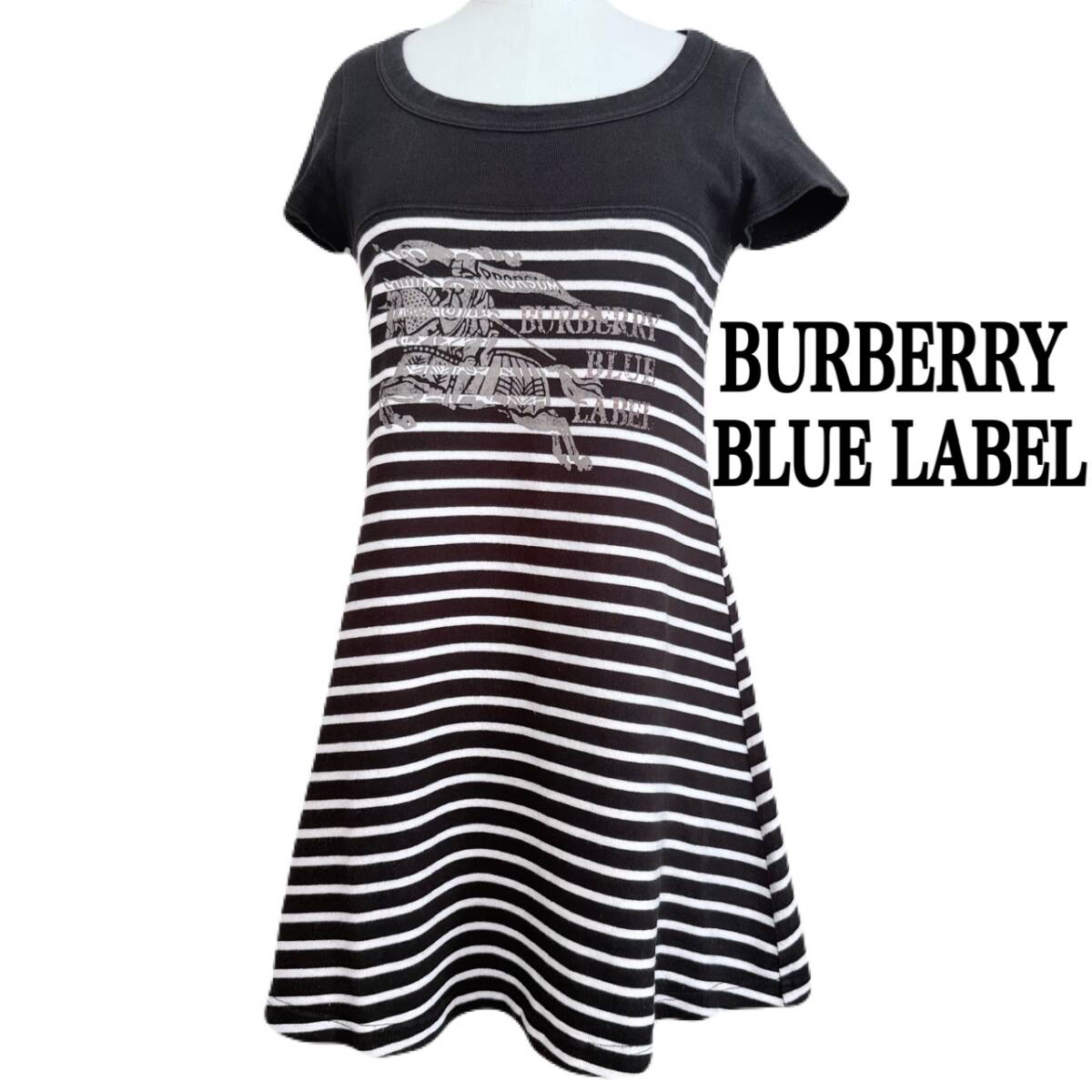 > 希少 BURBERRY BLUE LABEL バーバリーブルーレーベル ビッグ ホース ロゴ ボーダー Aライン ワンピース ミニ 38 ブラック ホワイト Y2K