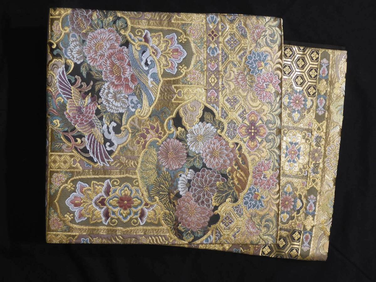 > <銀の斧>正絹・正装用吉兆文様袋帯・金糸たっぷり・花・鳳凰