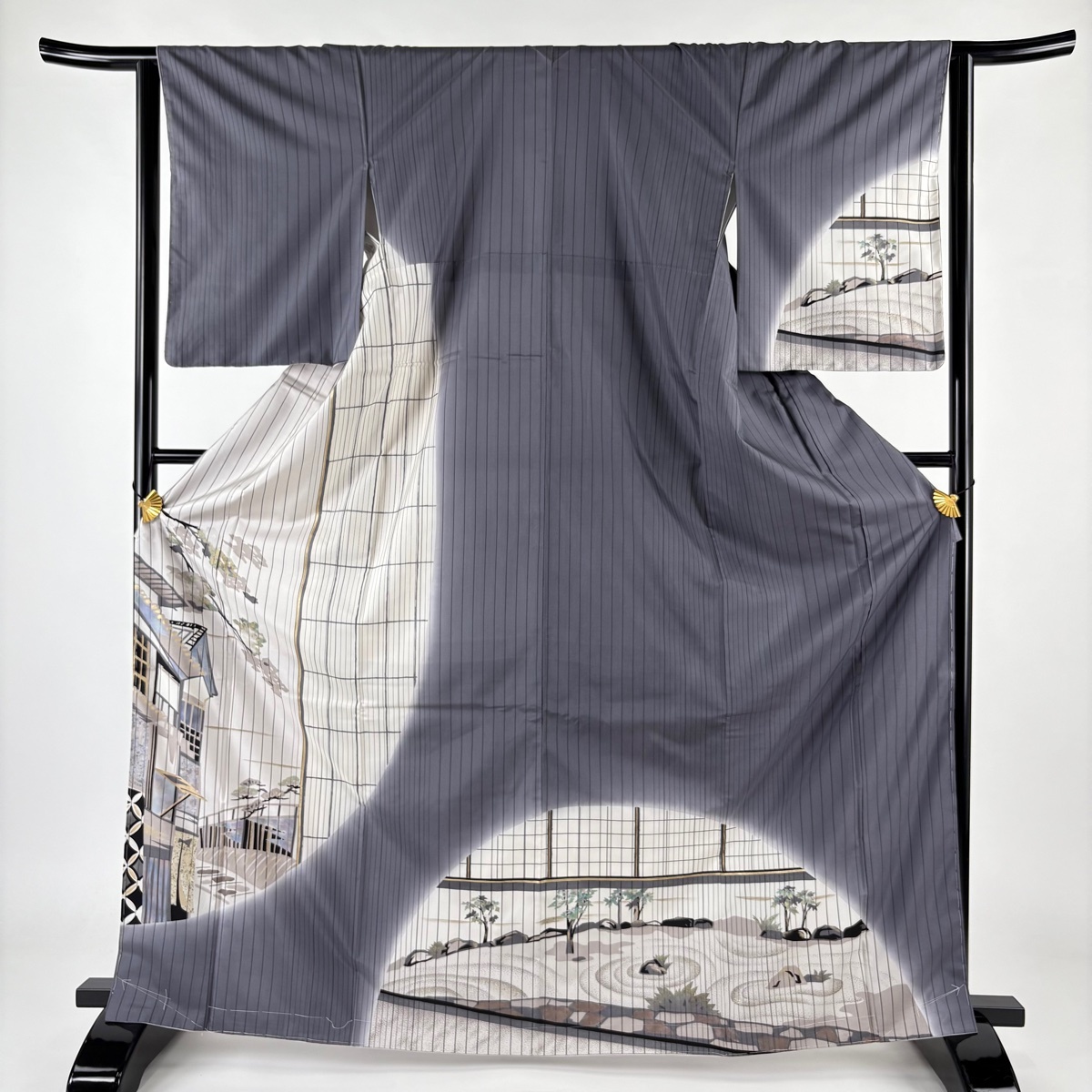 > 訪問着 身丈169cm 裄丈63.5cm S 袷 紬地 建物 枯山水 金彩 灰白 正絹 名品 【中古】