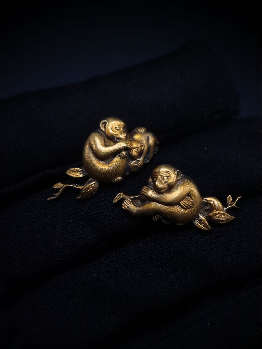 - s-149 親子金猿図目貫 容彫 金色絵 日本刀 武具 刀装具 銅製 小道具 鍔 目貫 縁頭 拵 長 2.7CM