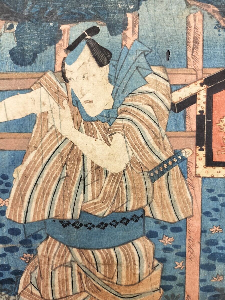 - 江戸期/真作 歌川豊国「大経師茂兵衛」本物浮世絵木版画 歌舞伎絵 役者絵 芝居絵 錦絵 大判 裏打ち