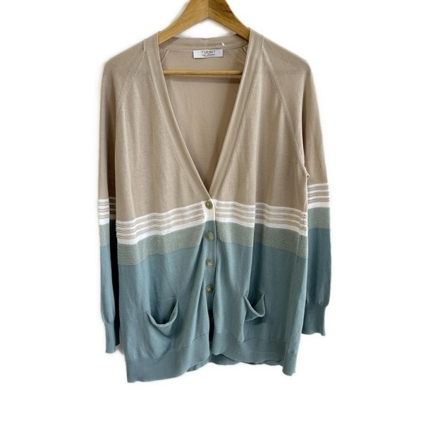 > レリアン Leilian カーディガン サイズ13+ S - ベージュ×ライトブルー×白 レディース 長袖/ラメ/ボーダー/TONET 美品 トップス
