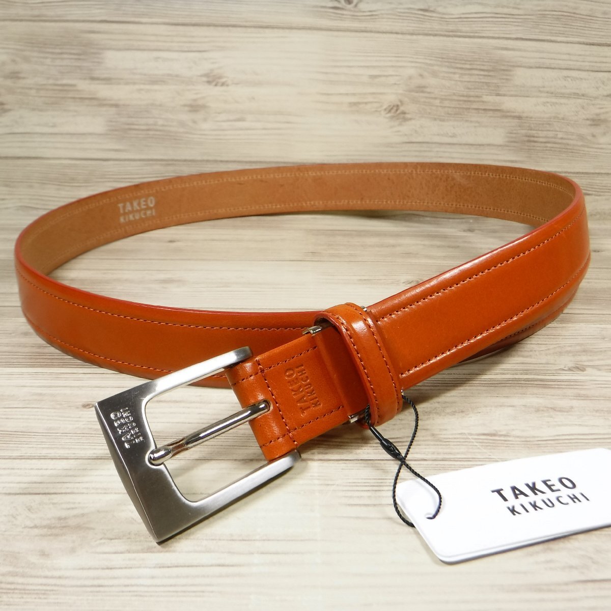 - V114 タケオキクチ 日本製 新品 オレンジ ロゴバックル 艶感 牛革 スムースレザー ベルト カジュアルベルト TAKEO KIKUCHI