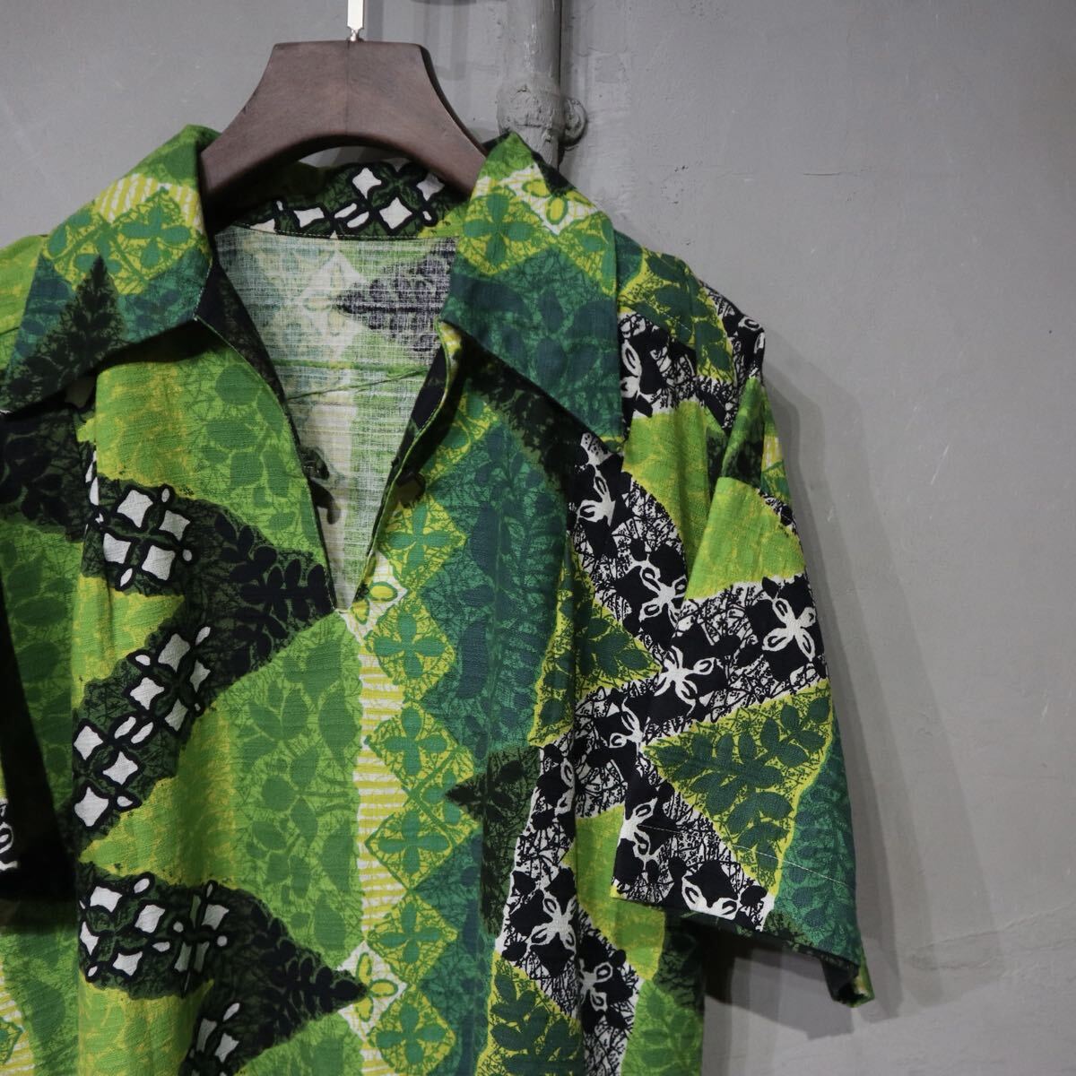 > 【即決】プルオーバー ハワイアン アロハシャツ ループカラー 総柄 緑 黄色 グリーン イエロー 古着ヴィンテージ ビンテージ