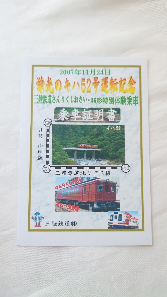 - ■三陸鉄道■栄光のキハ520号運転記念 乗車証明書■2007年