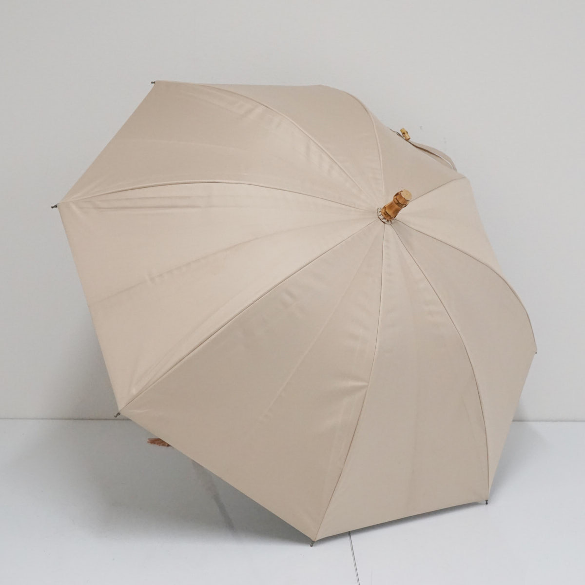 > 晴雨兼用日傘 utatane ウタタネ USED品 一級遮光 ベージュ シンプル バンブーハンドル タッセル付 グラス骨 UV 47cm A3087
