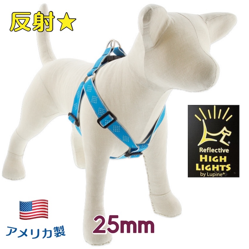 - ステップインハーネスLサイズ25mm幅 反射ブルーダイヤモンド柄 48-71cm LUPINE アメリカ製 軽量丈夫 大型犬 Reflective High Lights