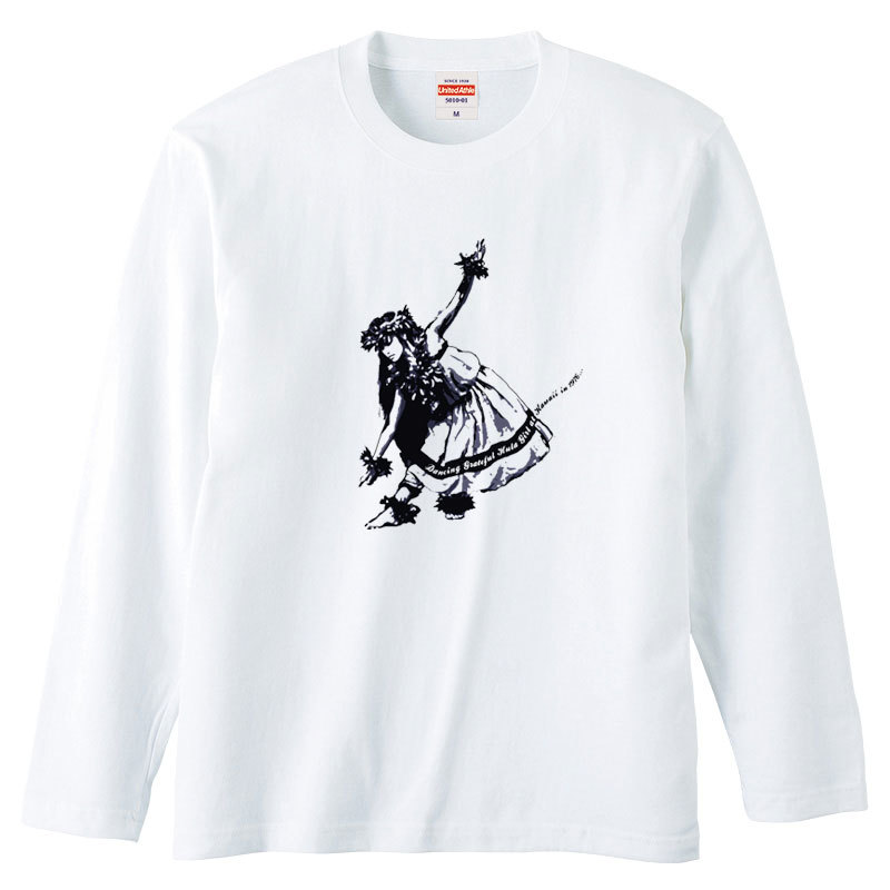- レディースL対応(タグ表記M)/ホワイト【tl093】*ダークネイビーダンシングフラガールハイビ*男女兼用長袖Tシャツフラダンスハワイ送料無料