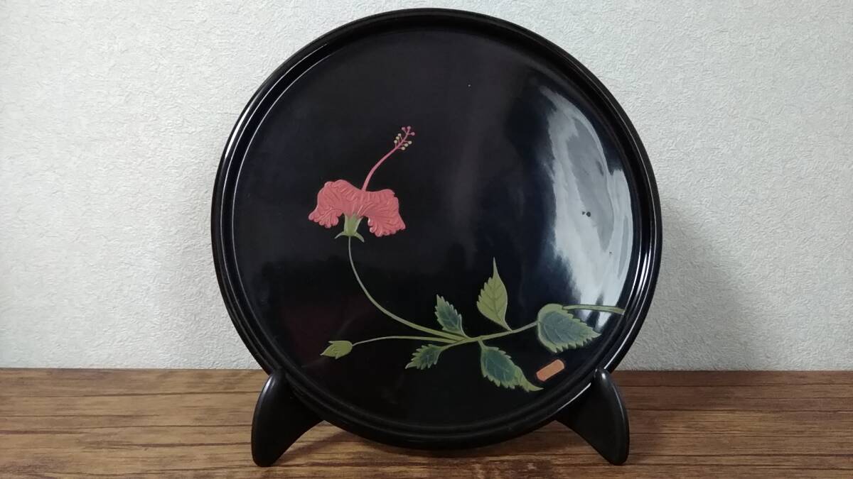 - ☆r☆【美術工芸・インテリア】宮崎産 琉球漆器 盛り皿 丸盆 菓子器 黒地 ハイビスカス 伝統工芸品☆