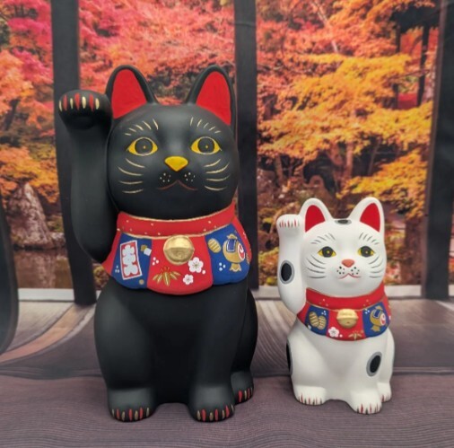 - 招き猫 縁起物 福づくし招き猫 右手上げ 黒 大 白 小 2体セット 置物