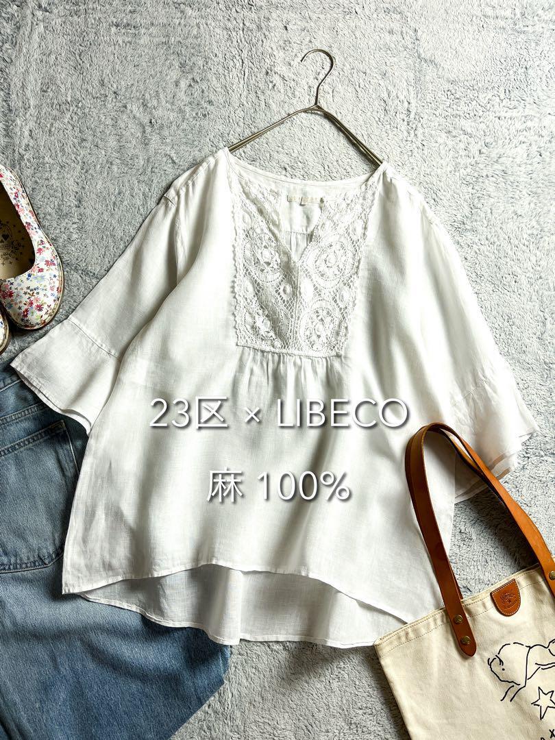 - 【23区】LIBECO リネン100% レース切替フレアブラウス ホワイト 38