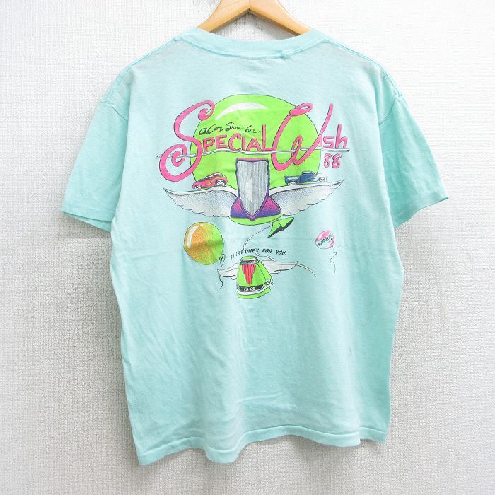 - L/古着 半袖 ビンテージ Tシャツ メンズ 80s 車 羽 風船 クルーネック 水色系 25aug07 中古