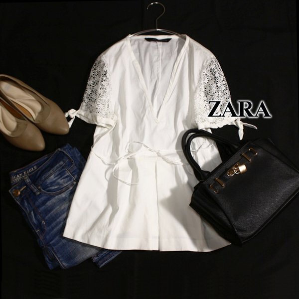 - 美品 ザラ ウーマン ZARA WOMAN 可愛い透けレース切り替え コットン カットソー L 春 夏 25A08