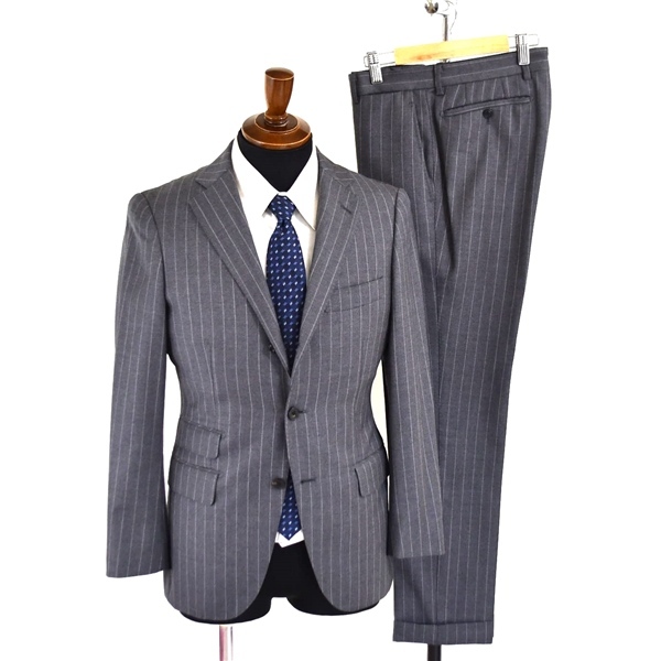3つボタンシングル。段返り。フラップポケット。サイドベンツ。袖口4つボタン。本切羽。総裏地仕上げ。ネーム刺繍なし。