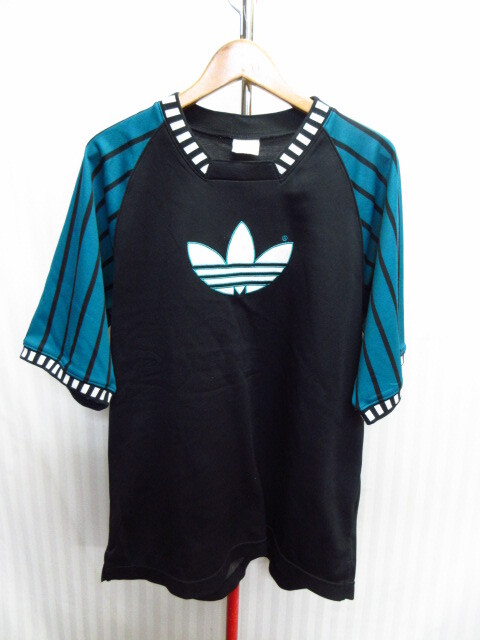 > アディダス 90sヴィンテージ ビッグトレフォイル半袖ゲームシャツ メンズL 黒緑系 サッカーシャツ スポーツTシャツ ジャージトップ08052