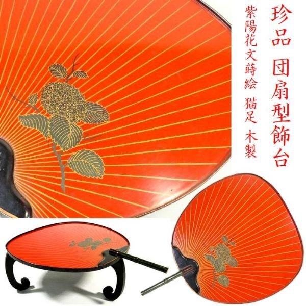 > 【 恵 #1784 】 珍品です!紫陽花文が見栄え良き 団扇型 猫足 飾台 木製 漆芸品 金蒔絵 飾り台 検:漆器/茶道/茶道具/華道/茶器