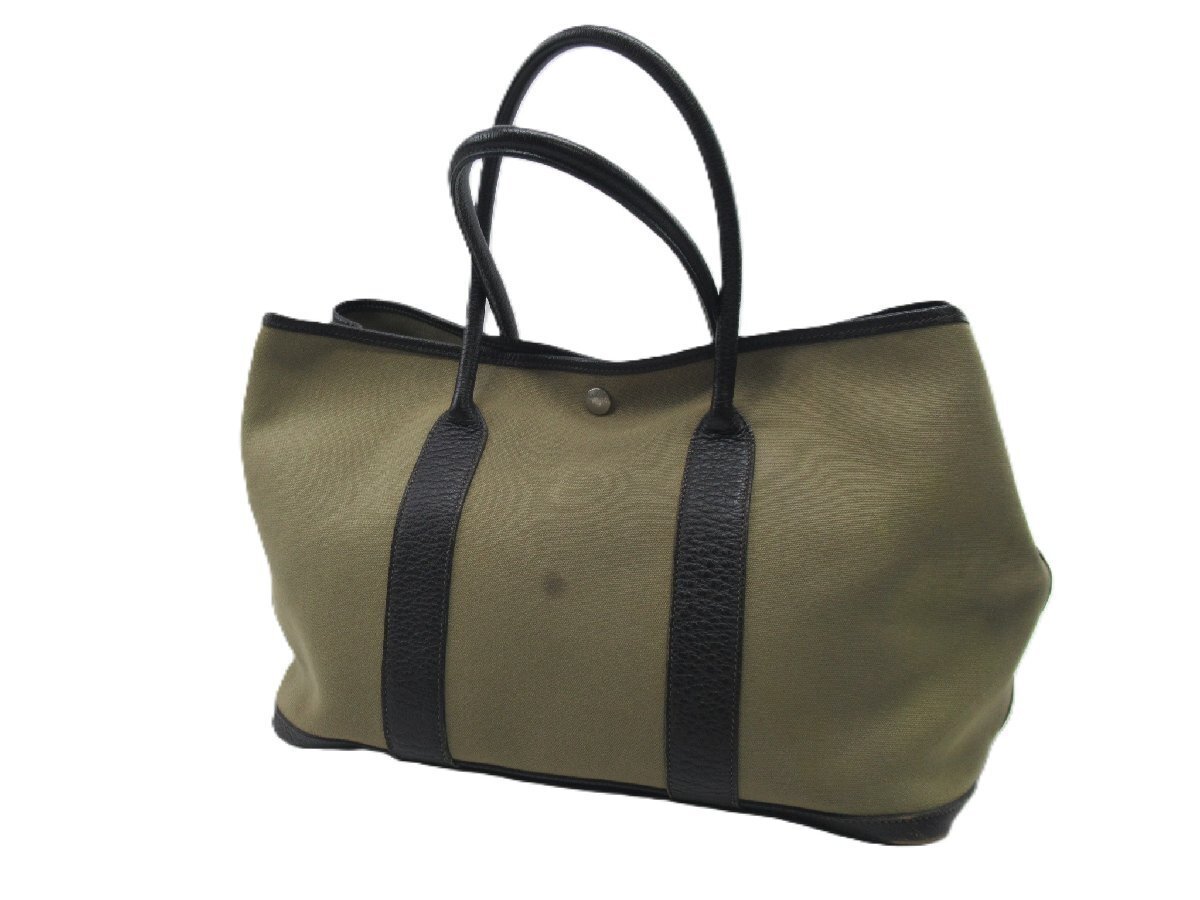 > ★【B送900円】2202 HERMES エルメス ガーデンパーティPM トートバッグ/ハンド キャンバス×レザー フランス製 カーキ T刻印