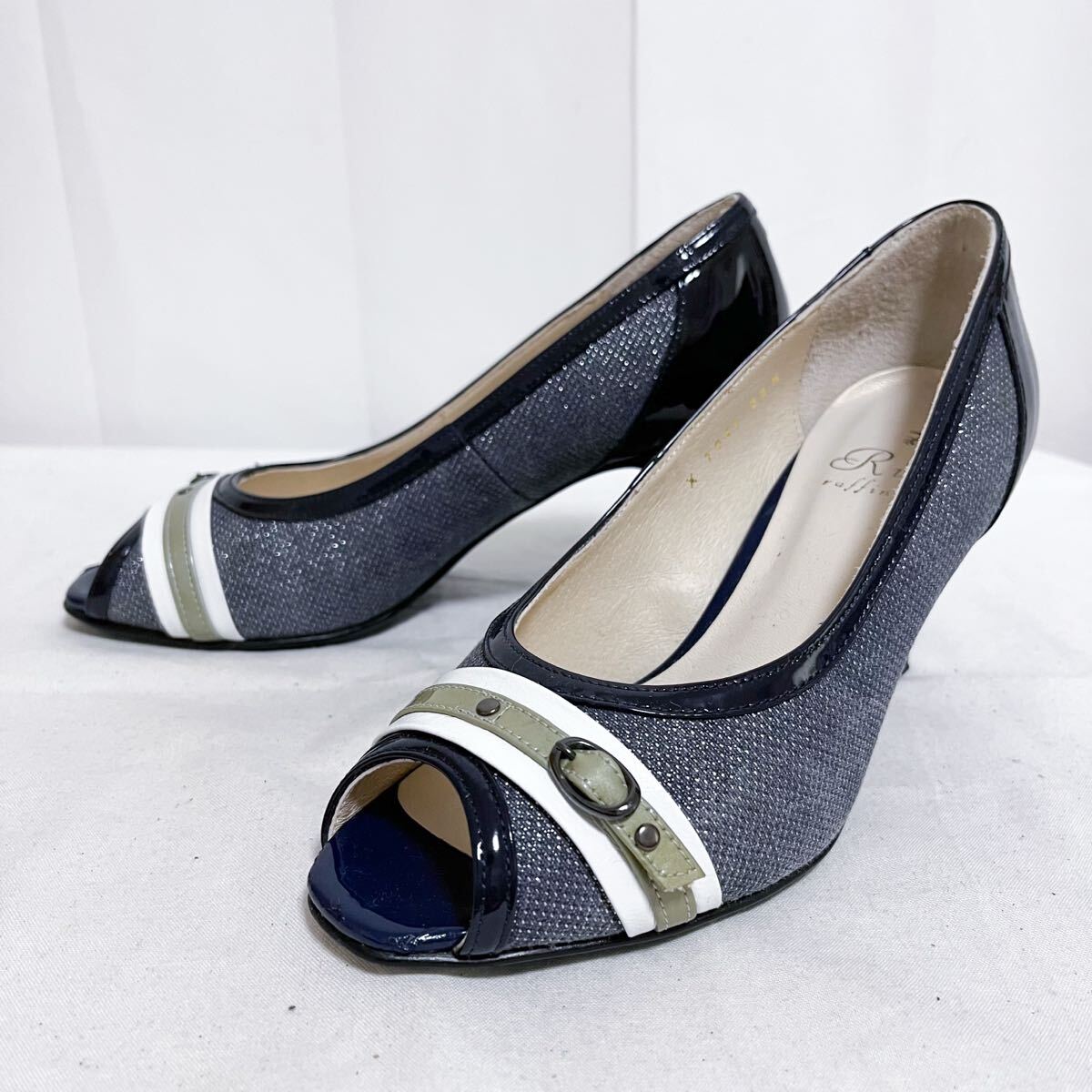 - 和788★① Riz raffinee リズ ラフィーネ パンプス オープントゥ ヒール エナメル切替 日本製 22.5 EE ネイビー レディース