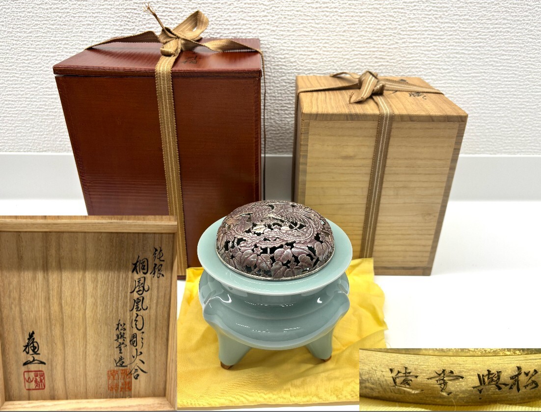 > 純銀★諏訪蘇山 青磁袴腰 香炉 『松興堂造』 細工 桐鳳凰肉彫火舎 二重箱 共箱 古美術品 鳳凰透