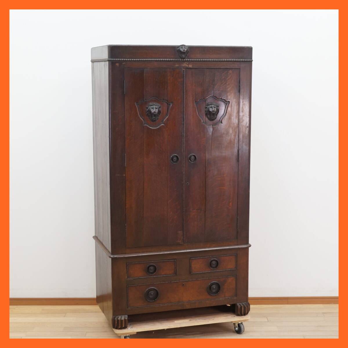 - 東ハ:【クラシックインテリア】ライオンヘッド 木彫り装飾 天然木 ワードローブ 幅約94㎝ 高さ約172.4㎝ 両開き扉 内部ミラー付 洋服タンス