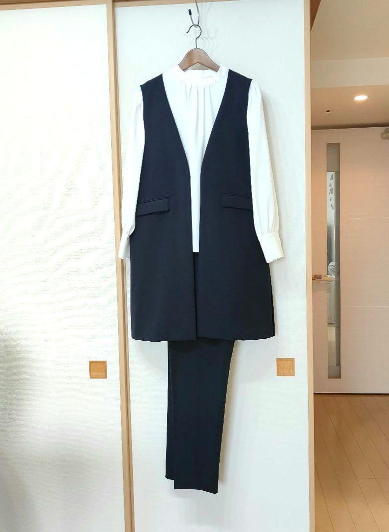 - ロングジレ スーツ3点セット ネイビー色 Lサイズ テーパードパンツ ブラウス