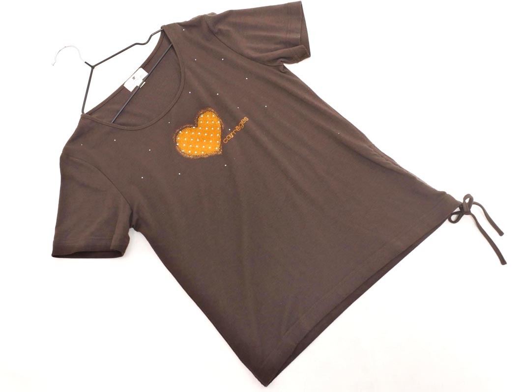 - ネコポスOK Courreges クレージュ ラインストーン フロッキー ギャザー カットソー size9R/茶 ■◆ ☆ fhb3 レディース