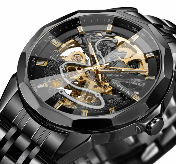 - 男性腕時計♪ 新入荷 機械式自動巻 3針 スケルトンデザイン シンプル メンズ ウォッチ 夜光表示 防水3ATM 紳士用 カジュアル 黒/ゴールド