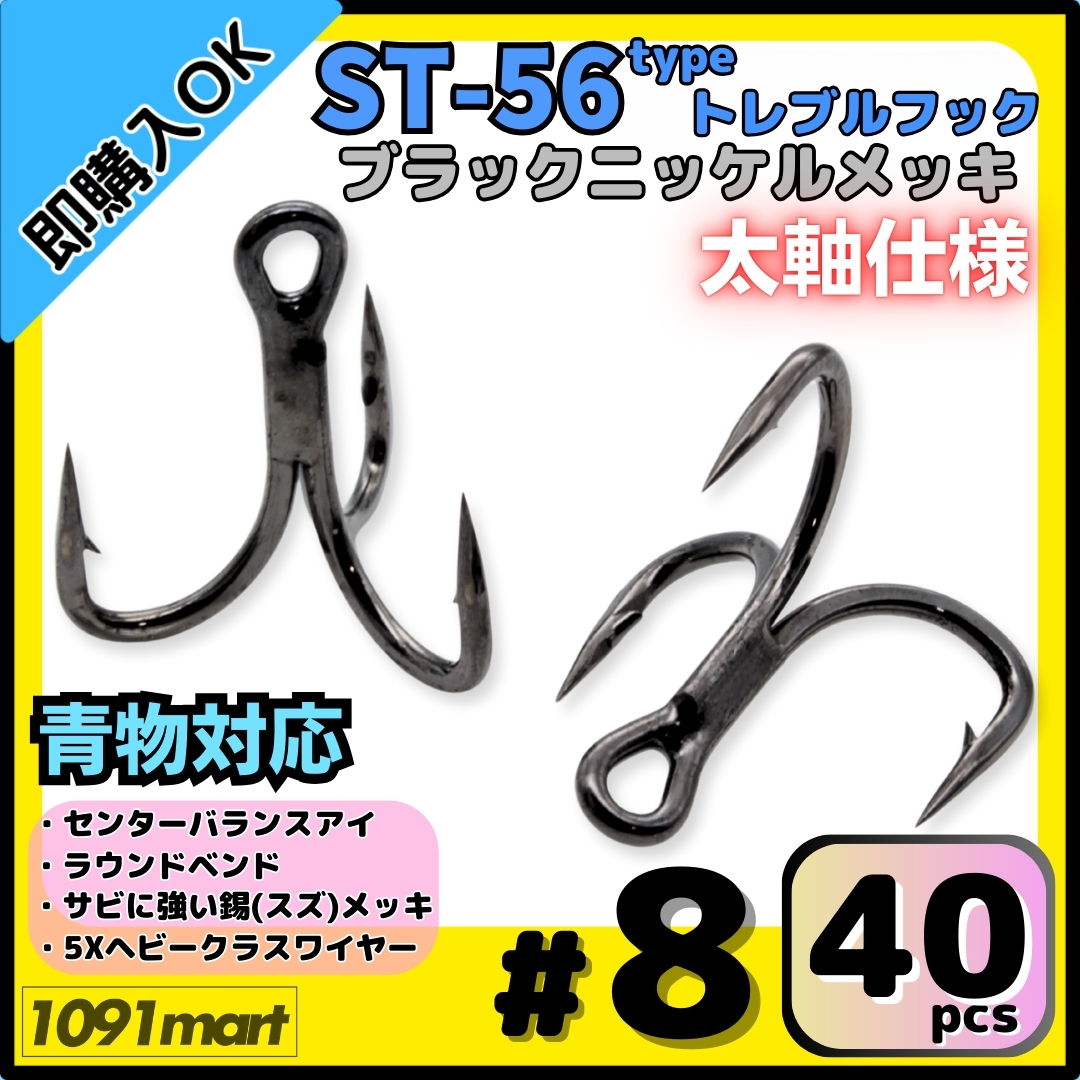 - 【送料無料】ST-56タイプ 防錆トレブルフック #8 ブラック 40本セット 太軸 5Xワイヤー使用 大物 青物対応 ヘビークラストリプルフック
