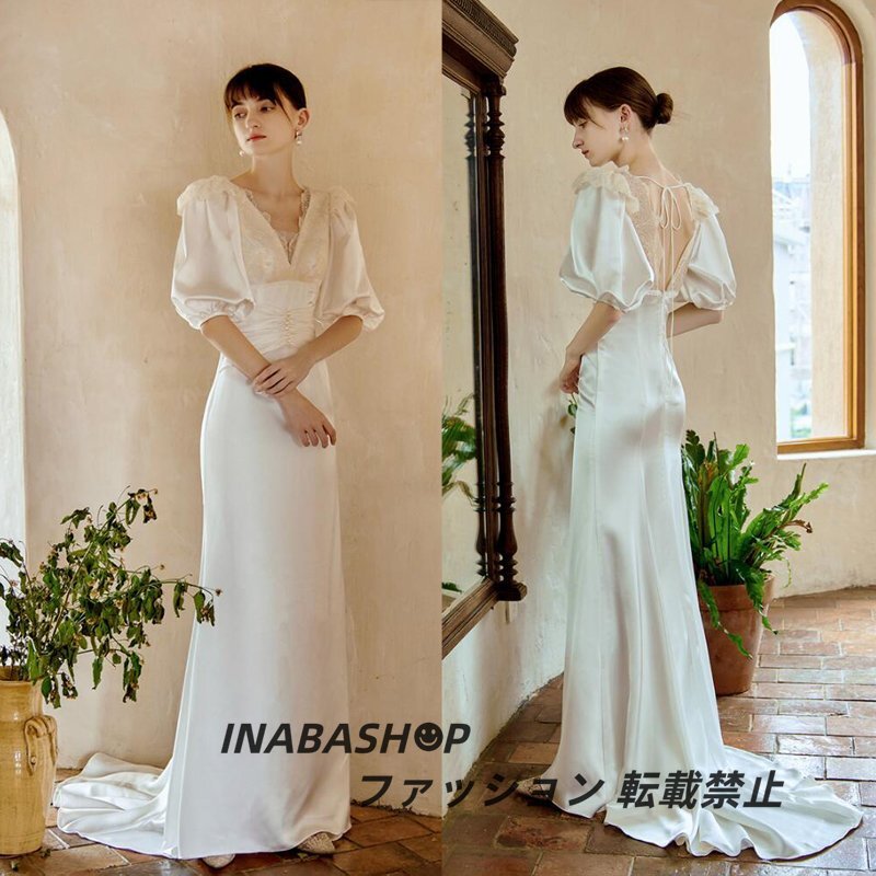 - Vネック ウェディングドレス マーメイドライン トレーンドレスングドレス サテン 袖あり オフホワイト 披露宴 結婚式 演奏会海外挙式ドレス