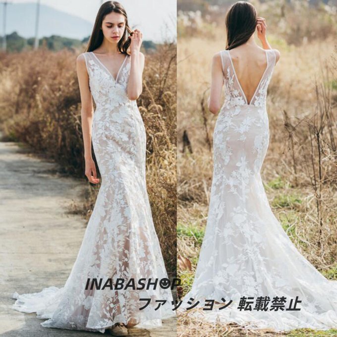 - ウェディングドレス ノースリーブ マーメイドライン Vネック ウエディングドレス マーメイドドレス 白 花嫁ドレス 背中空き 前撮り