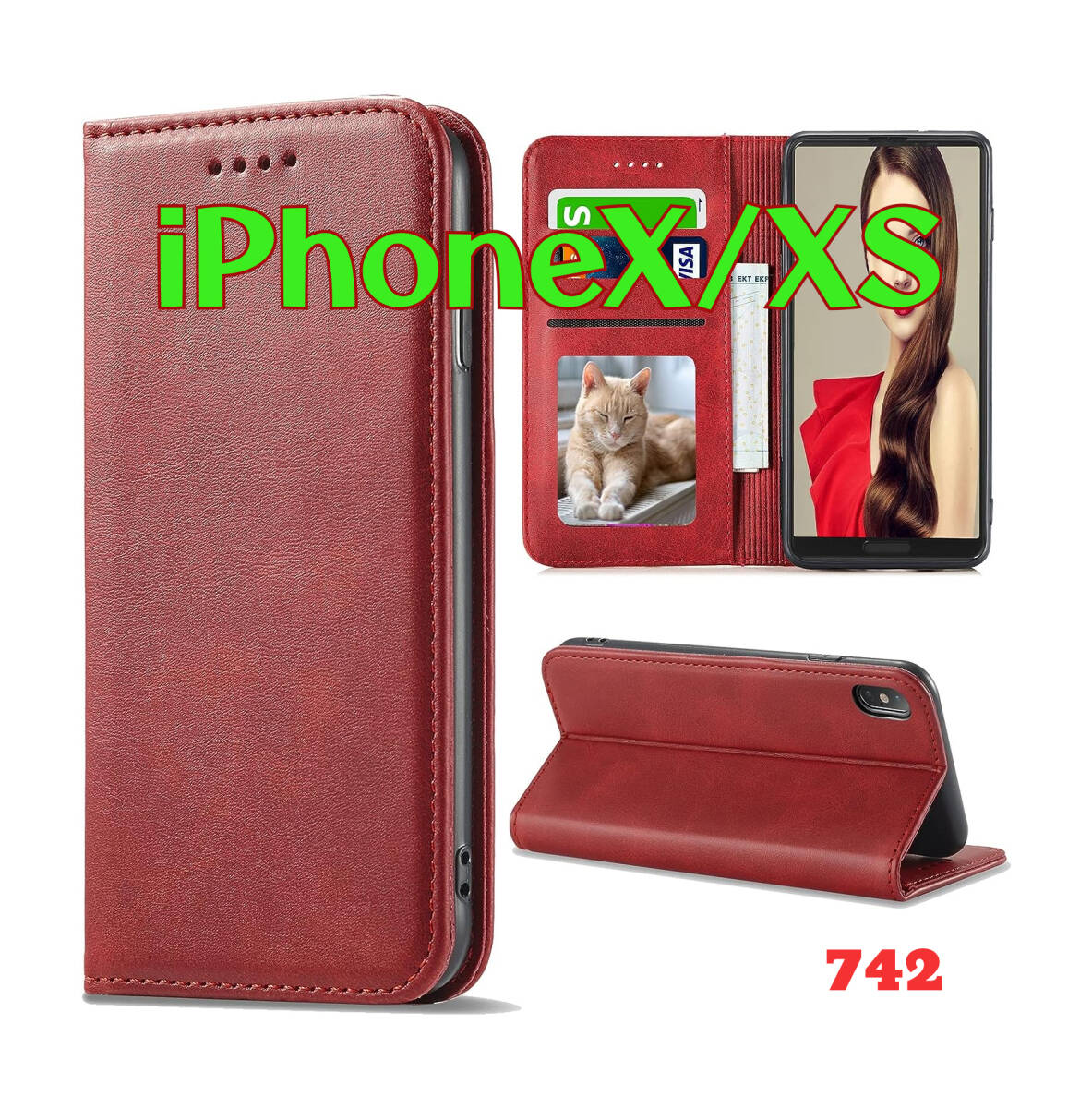 - iPhoneX iPhoneXS ケース 手帳型 肌触り良い PUレザー ストラップホール付き マグネット内蔵 スタンド機能 耐衝撃 全面保護 レッド ay743