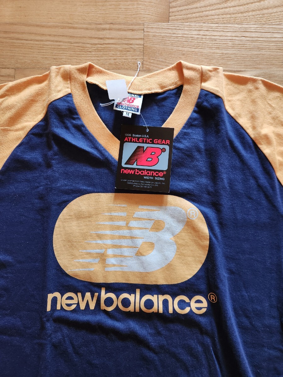 > 新品 1990年代製■new balance ニューバランス NB-61545 Vネック切り替え 半袖Tシャツ スポーツ 日本製 ネイビー×イエロー M