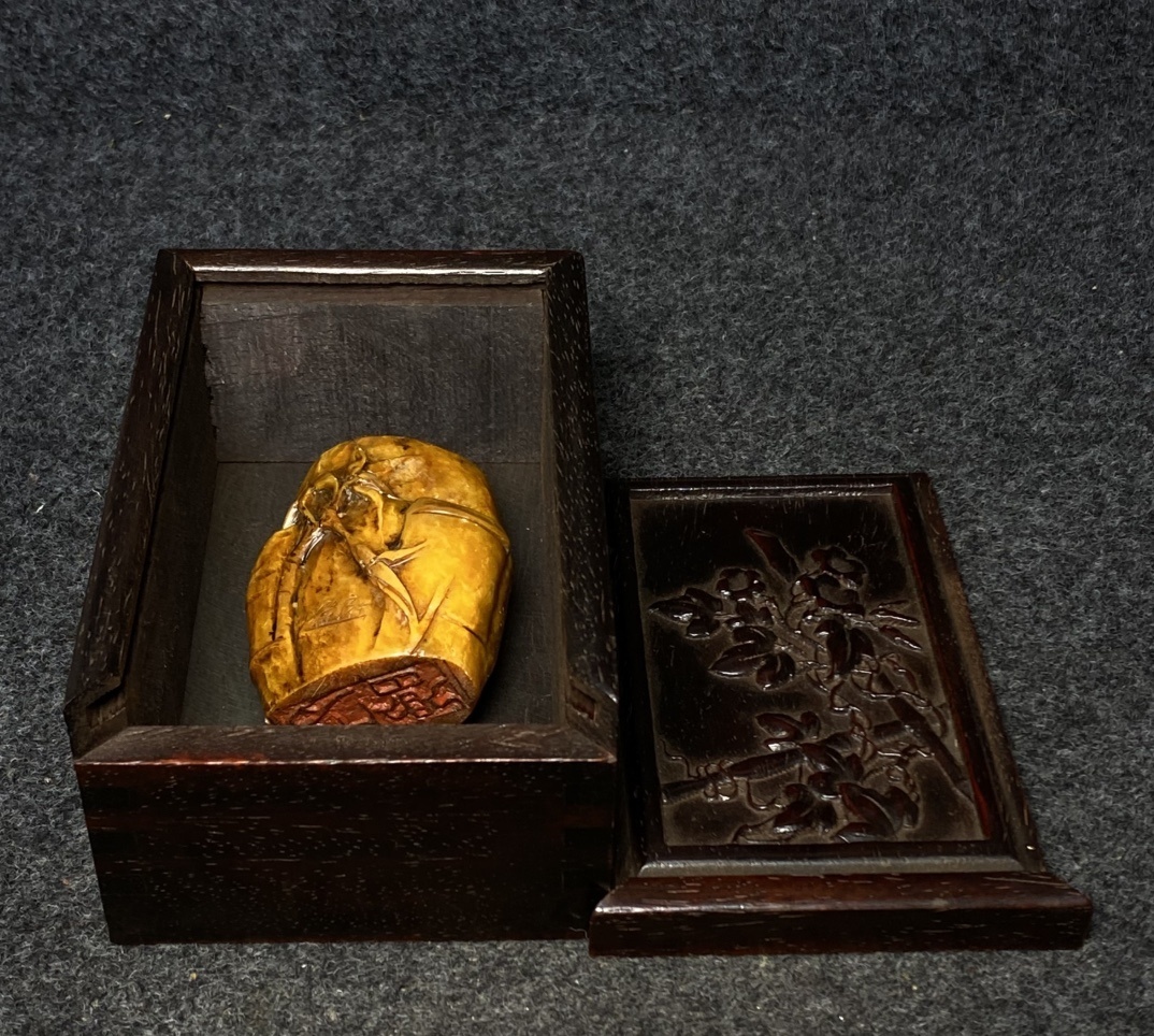 > 秘蔵 古木彫り 花梨木彫 り箱に寿山石印を入れる 清代 書道具 文房具 時代物 中国古美術 細密彫 置物 賞物 唐物 木彫り 文玩 8.16