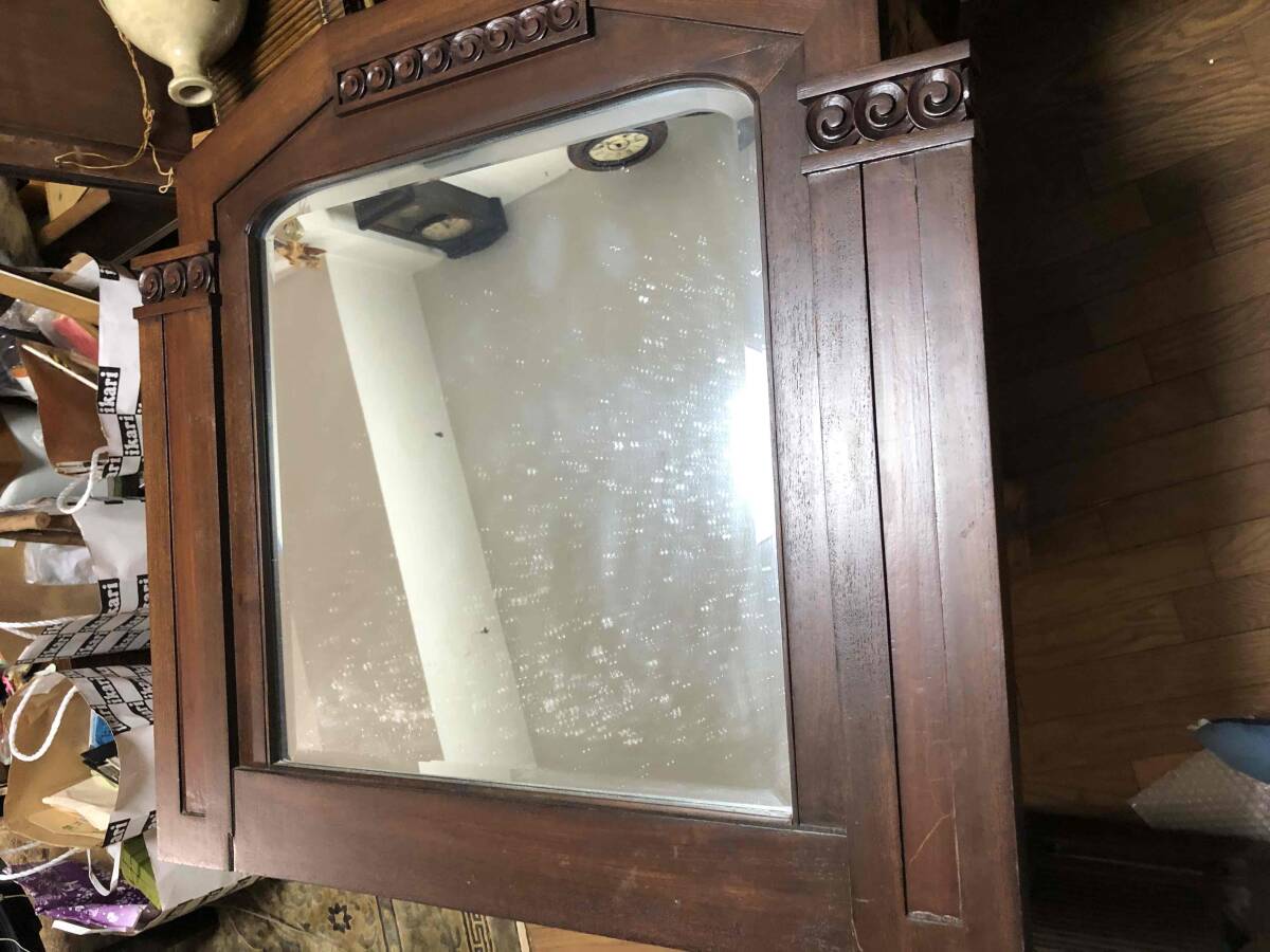 > 【アンティーク・古道具・古民家】装飾彫刻 昭和レトロ 木製額縁 彫刻付き 大型壁掛け鏡 古家具 レトロインテリア 直接引き取り希望