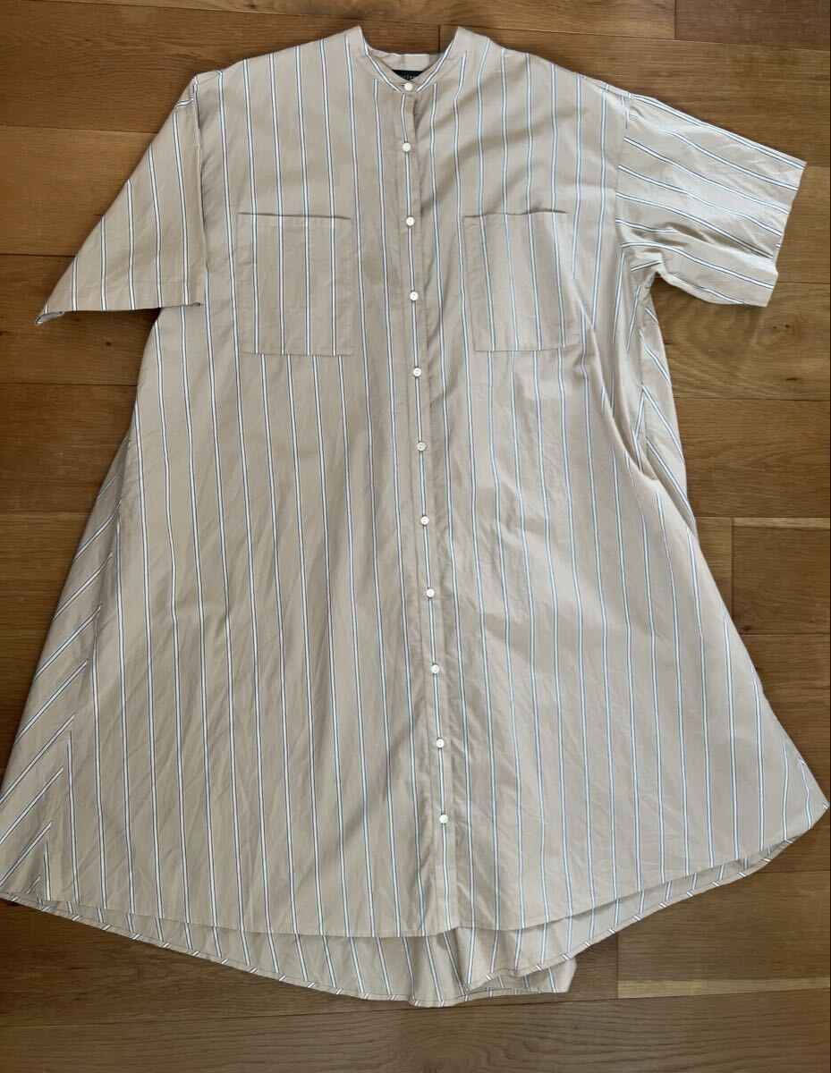 > 美品 mizuiro ind ミズイロインド ★ 半袖 ストライプ柄 バンドカラー フレア 2way ワンピース ボタン開き ギャザー ベージュ 完売