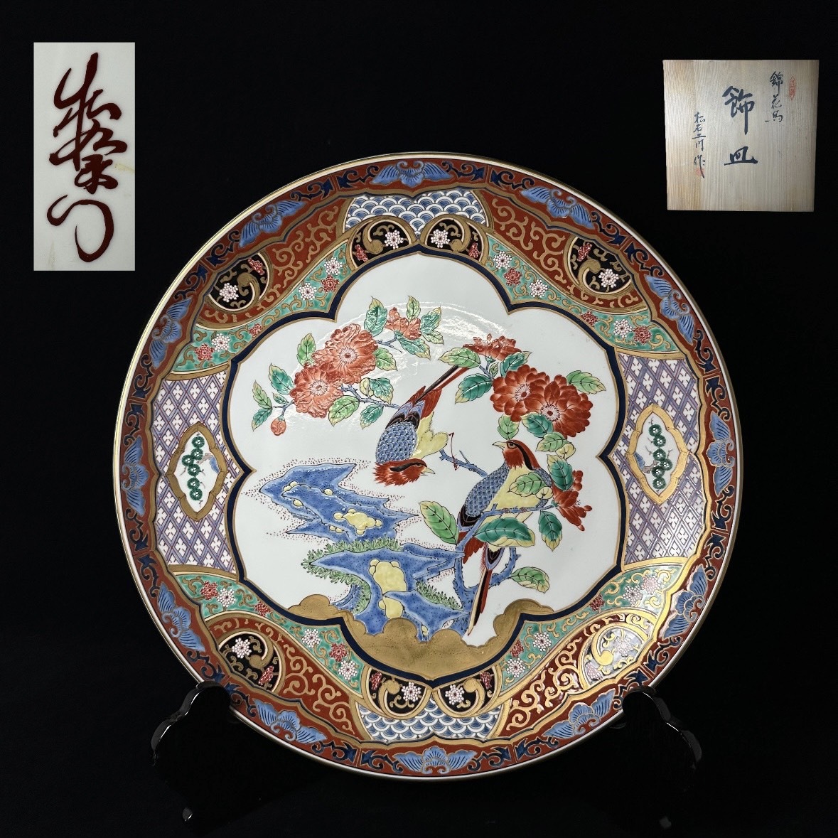 - コレクター買取品 有田焼 伝統工芸士 緒方松右衛門 作 赤絵金彩飾皿 56㎝ 在銘 共箱 皿立付 染錦 色絵 飾物 置物 時代物 骨董品 古美術