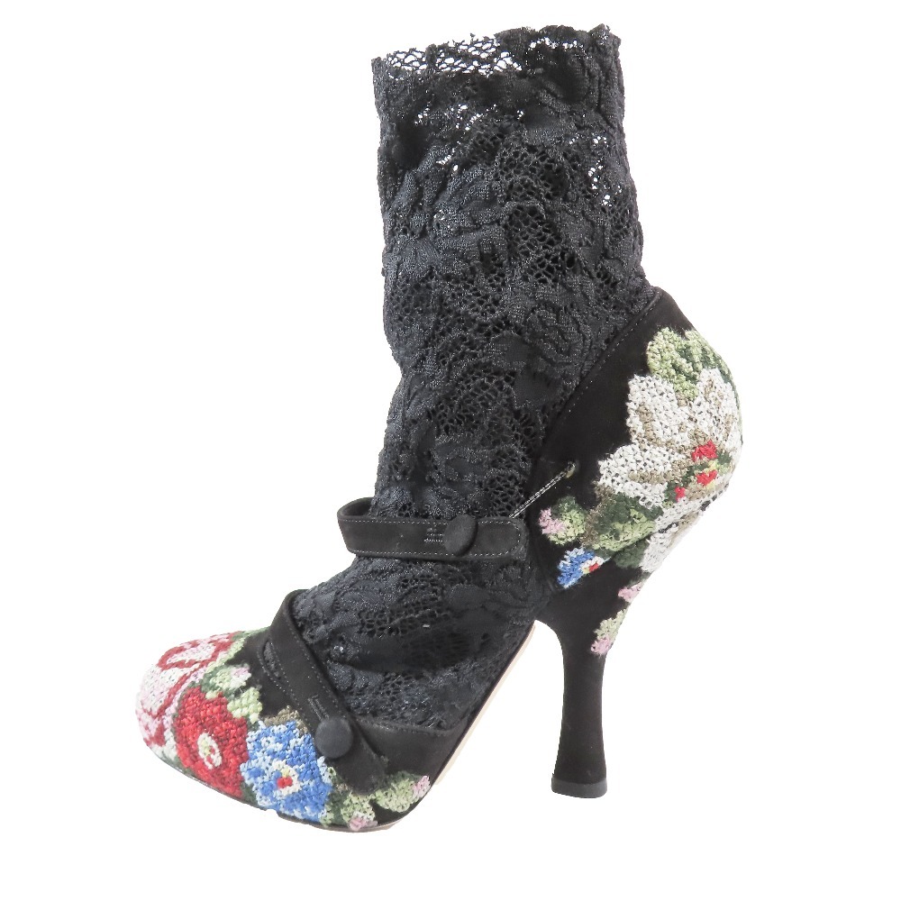 - 未使用 DOLCE&GABBANA ドルチェアンドガッバーナ ソックスブーツ レース パンプス ヒール フラワー刺繍 花柄 靴 シューズ ブラック 35