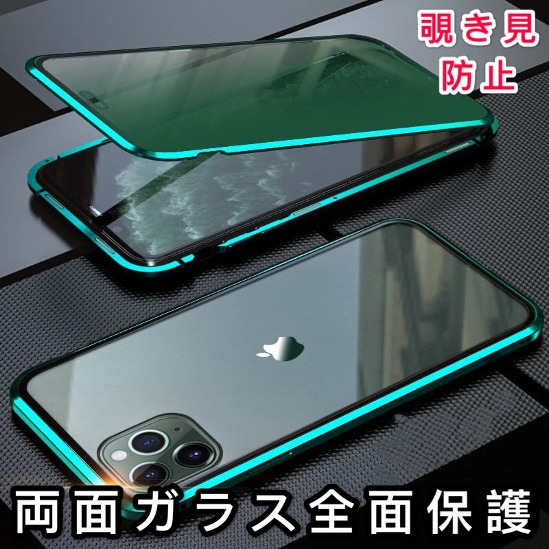 - iPhone 11 グリーン 覗き見防止 両面強化ガラス 全面保護 アルミ合金 磁気吸着 耐衝撃 iPhone XS 11 12 13 14 15 Pro max mini Plus ケース