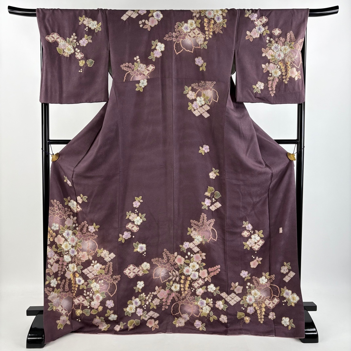 - 訪問着 身丈173.5cm 裄丈69cm L 袷 徳永憲峯 落款 辻が花 桐 銀通し 金彩 紫 正絹 逸品 【中古】