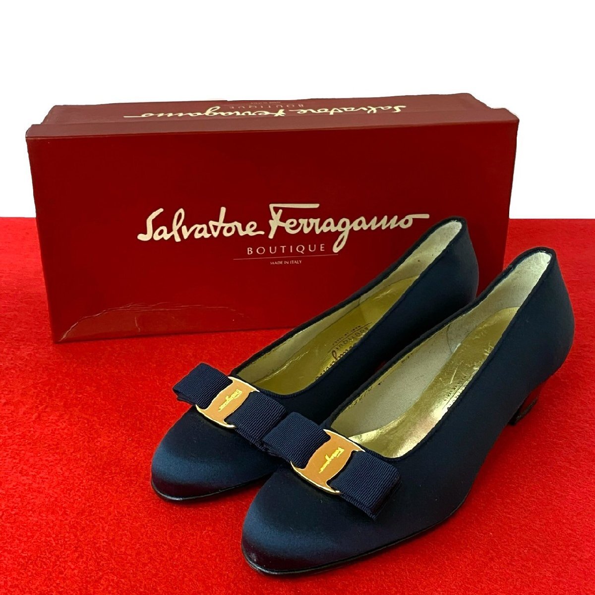 - 未使用保管品 箱付き Salvatore Ferragamo サルヴァトーレフェラガモ ヴァラリボン 金具 サテン パンプス サイズ 6 1/2 ネイビー 96480