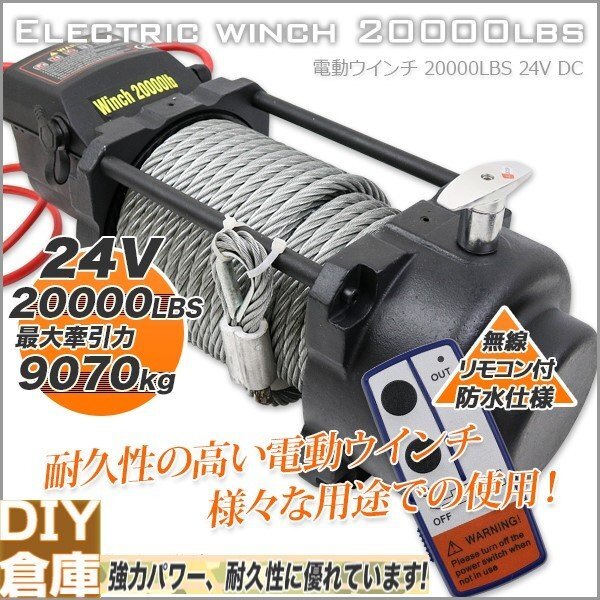 - 【チャータ便】無線リモコン付 電動ウインチ DC24V 最大牽引20000LBS(9072kg) 電動 牽引 ウインチ 移動 運搬 巻き上げ 送料無料