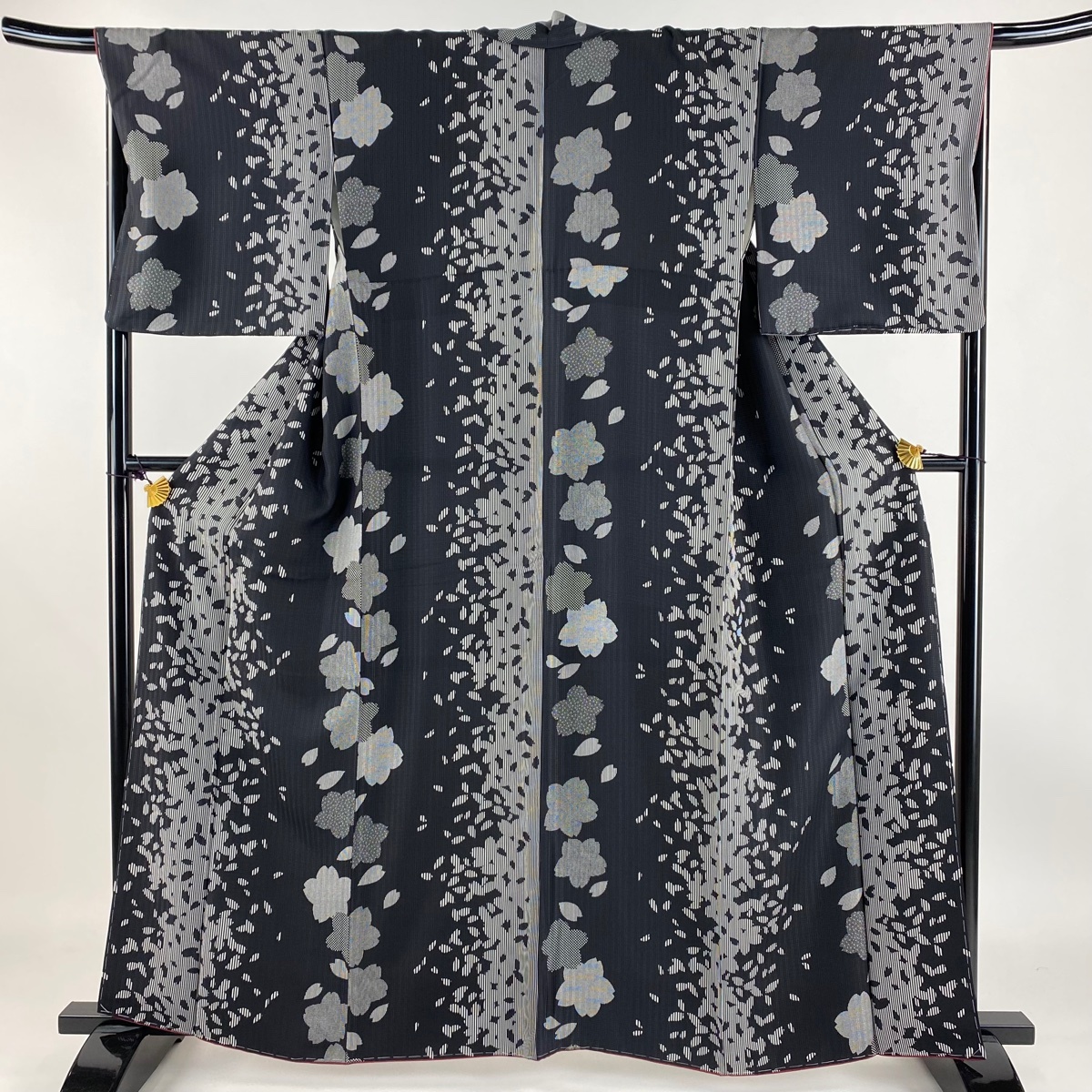 - 小紋 身丈160cm 裄丈67cm M 袷 桜 桜の花びら 墨色 正絹 美品 名品 【中古】