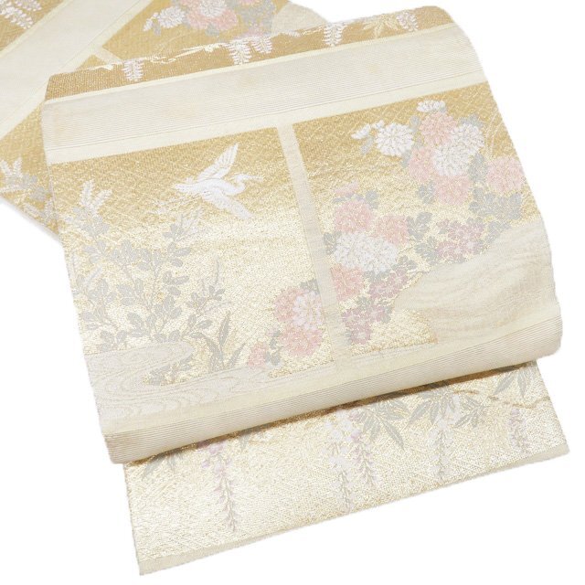 - 夏物 夏帯 袋帯 中古 リサイクル 正絹 フォーマル 仕立て上がり 六通 花鳥模様 鶴 藤 菊 箔糸 多色 金 きもの北條 A1259-18