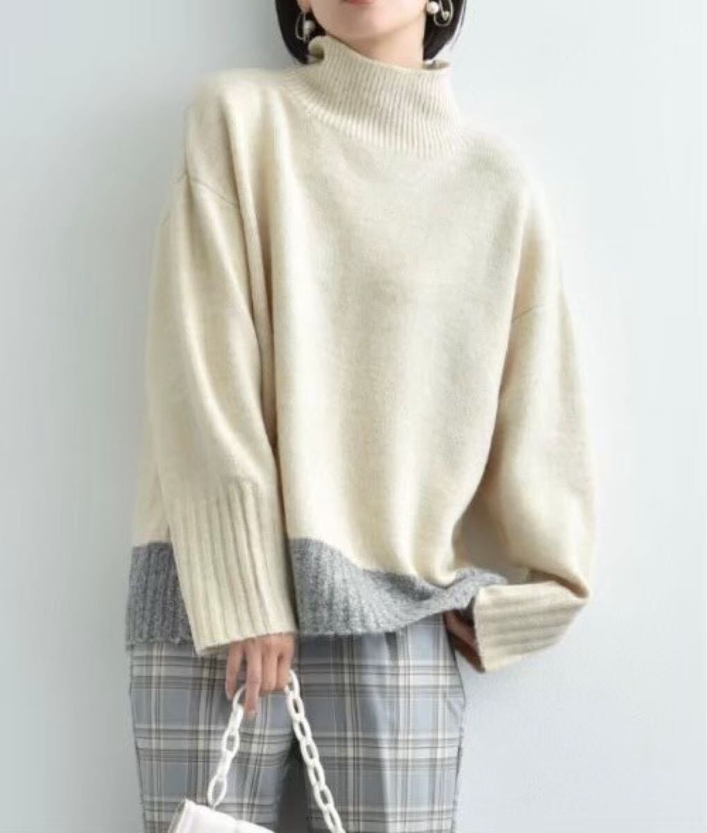 > 未使用☆インタープラネット INTERPLANET 配色プルオーバートップス セーター ニット 長袖 F アイボリーグレー