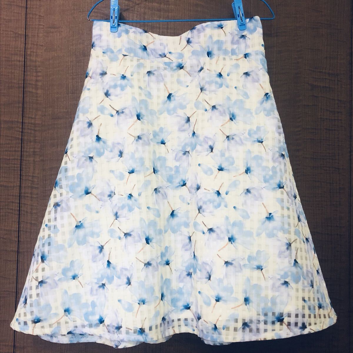 - Fサイズ MIIA ゴム入ウエスト オーガンジー青と白の花柄フレアスカート