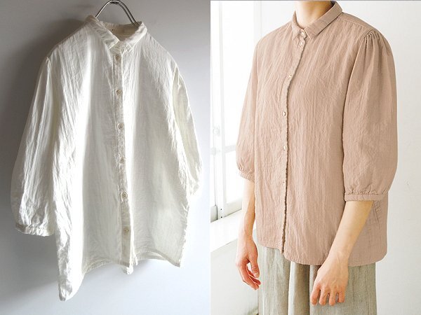 > ao daikanyama アオダイカンヤマ 七分袖 ギャザー袖 パフスリーブ コットン 二重織ガーゼ ブラウス シャツ L 白 ナチュラルホワイト 日本製
