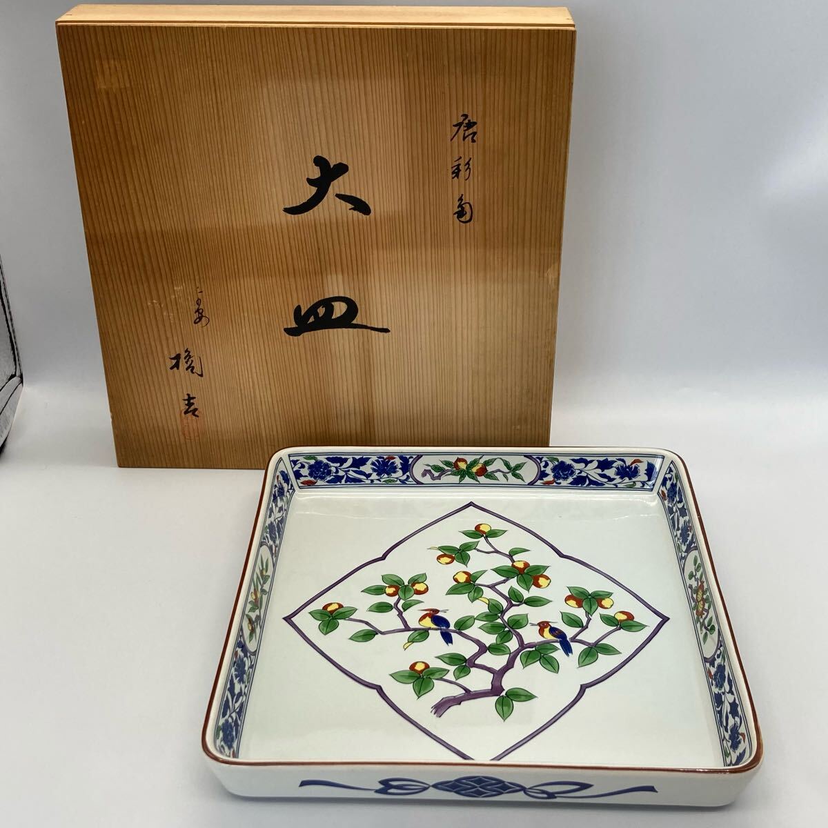> M0822706B たち吉 唐彩 大皿 京都たち吉 四角 スクエア 角皿 レトロ 和食器 鳥 スクエアプレート 陶磁器 大盛皿 橘吉 当時物 中古品 現状品
