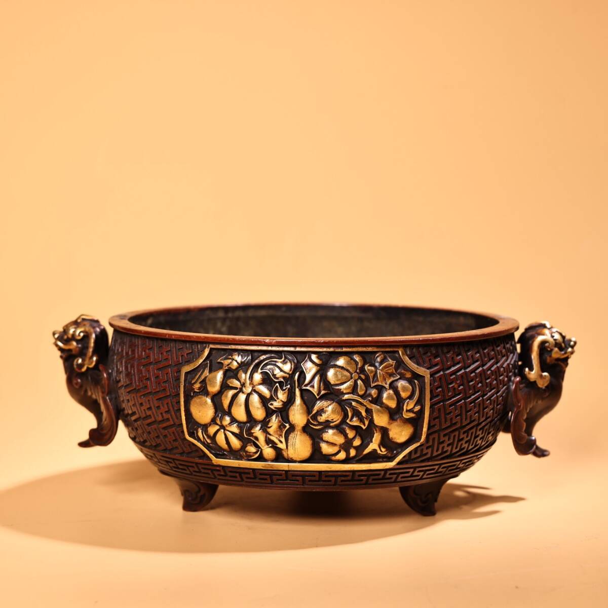 - 『館蔵珍品 銅製 塗金 雙獣耳 熏香炉 置物 賞物』稀少珍蔵品 古賞物 貴重物品 収蔵品 中国古美術 時代物 古董品