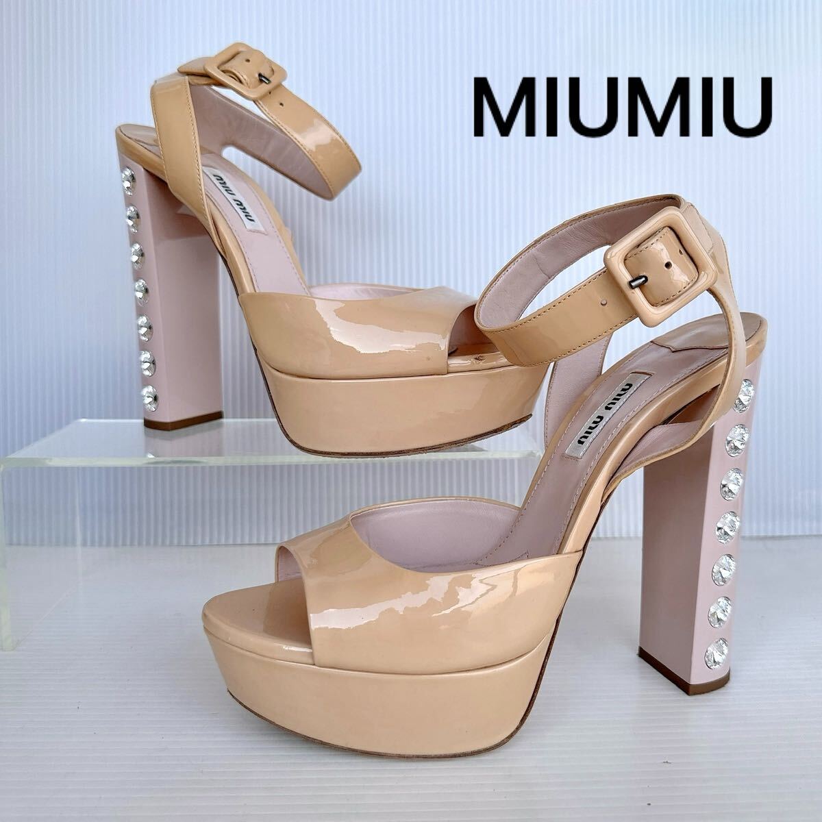 - MIUMIU ミュウミュウ ストラップ クリスタル ビジュー 太ヒール サンダル ハイヒール パンプス オープントゥ 37.5 レーディス 靴 シューズ